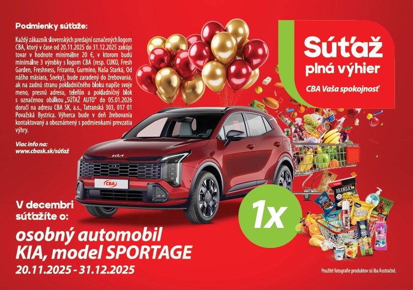 | PRAVIDLÁ SPOTREBITEĽSKEJ SÚŤAŽE: Každý zákazník slovenských predajní označených logom CBA, ktorý v čase od 20.11.2025 do 31.12.2025 zakúpi tovar v hodnote minimálne 20 €, v ktorom budú minimálne 3 výrobky s logom CBA (resp. CUKO, Fresh Garden, Freshness, Frizanto, Gurmino, Naša Starká, Od nášho mäsiara, Sneky), bude zaradený do žrebovania, ak na zadnú stranu pokladničného bloku napíše svoje meno, presnú adresu, telefón a pokladničný blok s označenou obálkou „SÚŤAŽ AUTO“ do 05.01.2026 doručí na adresu CBA SK, a.s., Tatranská 303, 017 01 Považská Bystrica. | |||